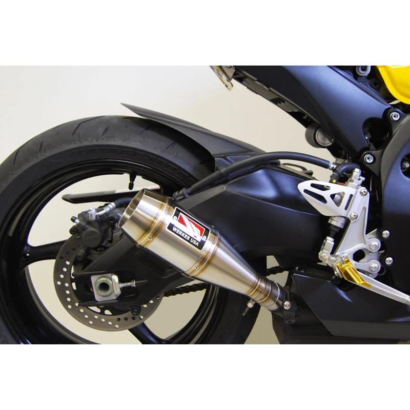 All of Competition Werkes Exhausts are TIG welded by hand in the USA, resulting in a decidedly custom look reminiscent of modern GP machines. Only high-quality, laser-cut 304 stainless steel is used due to its durability and rust resistance.