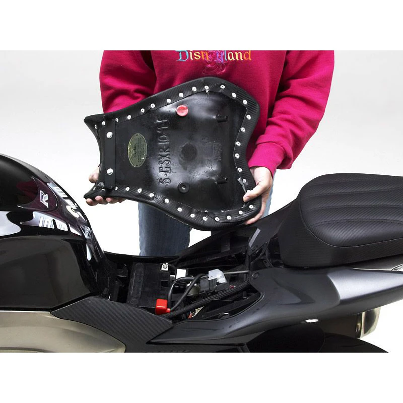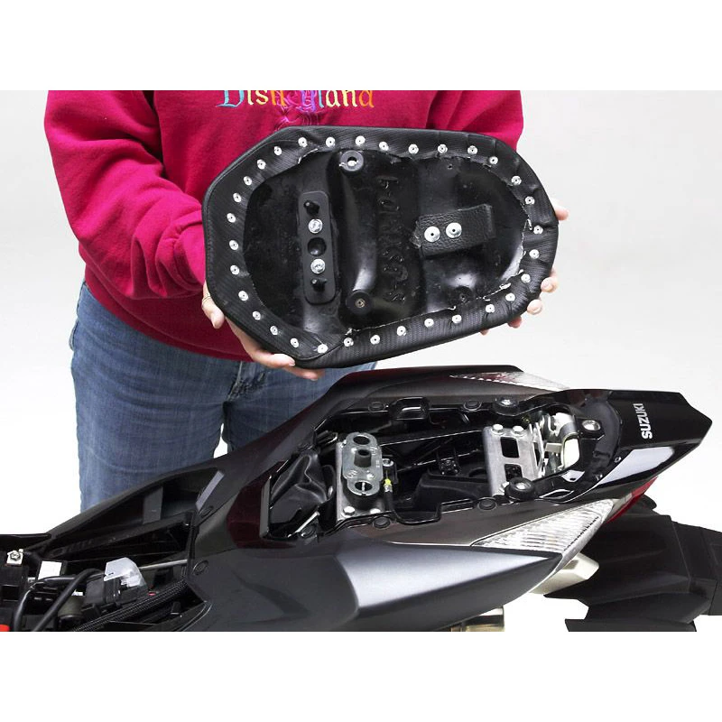 - Rear seat installs easily and uses the stock Suzuki key lock system. Brackets are included that integrate with your Gixxer mechanism and come premounted on the seat as shown.