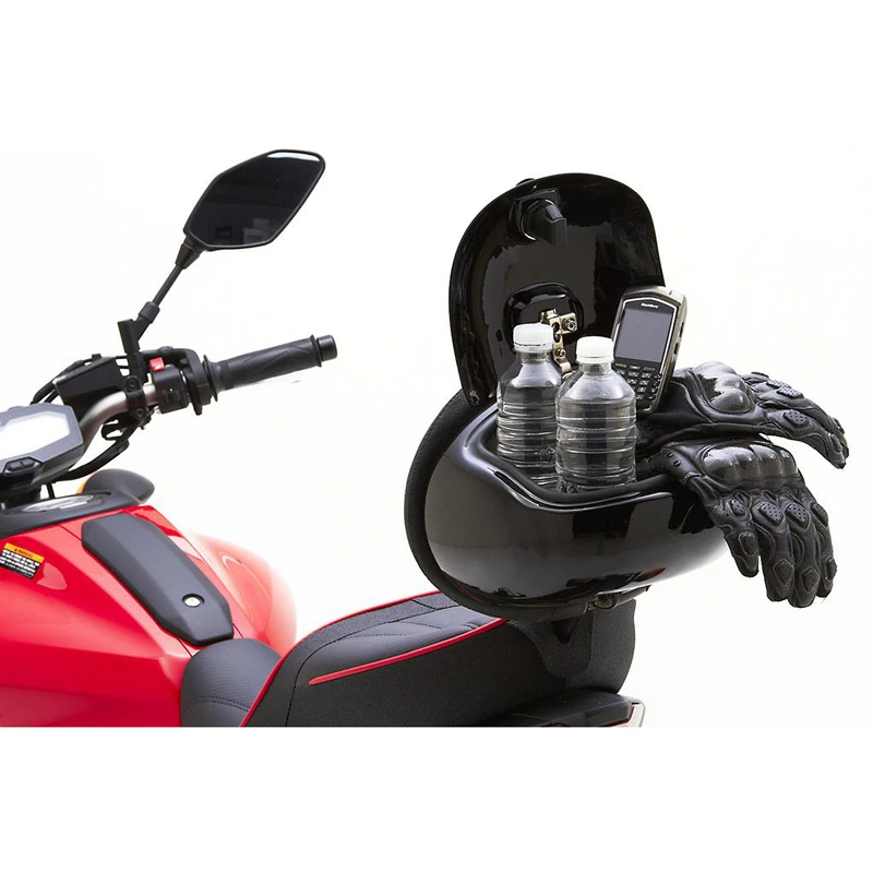 - provides secure storage for all your small travel essentials like spare gloves, bottled water, GDO remote and cell phone.
