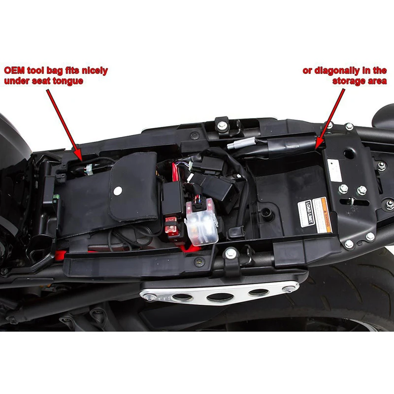 - In order to smooth out the basepan, we did not include the tool pouch holder in the base of the seat. It fits quite well under the seat tongue as shown or diagonally in the toolbox.