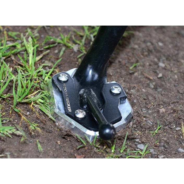 Side Stand enlarger that will help keep your bike from falling over or sinking into the ground. This enlargement is made of aircraft grade aluminum and offers a 100%+ increase in size.