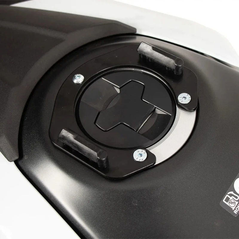 The Basic Tank Ring tank bag mount from Hepco & Becker is the proprietary mounting plate needed to equip your bike with a Hepco & Becker tank bag. What makes the Basic Tank Ring different from a Lock-it tank ring is the change from a magnetic locking system to a fully mechanical system. This allows us to provide a slightly more budget option for tank bags while still providing a strong and sturdy connection between the ring and your bag. The tank ring is integrated to your bike’s fuel filler cap with screws and features small magnet for the bag to attach to.Â