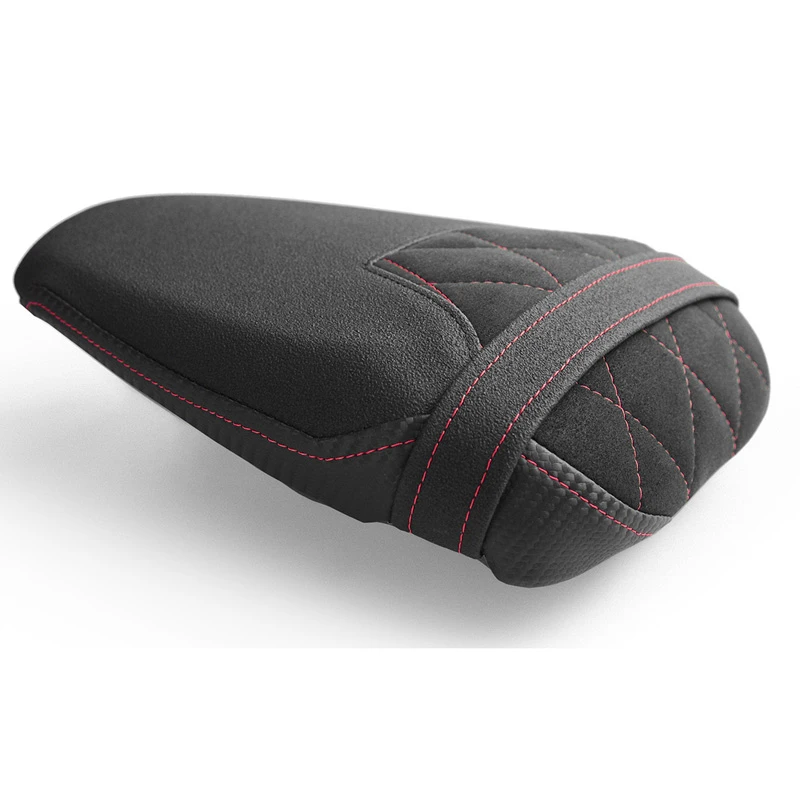 The passenger seat cover features diamond stitching on a luxurious synthetic suede seating surface. The carbon fiber look panels and Tec-grip passenger strap are also sewn with contrast stitching to match your Diamond Edition rider seat cover. Stand out with the finishing touch of Luimoto.