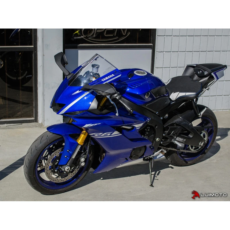 Maximize the style of your 2017 R6 with a Team Yamaha seat cover! The seat cover features a full marine-grade vinyl construction ready for all outdoor conditions. The Tec-grip riding surface is our grippiest material, perfect for aggressive maneuvers. Yamaha hammer head graphics and carbon fiber look panels with contrast stitching perfectly compliment your R6. Luimoto’s seat covers are custom made to order. Please allow 2 weeks for manufacturing.