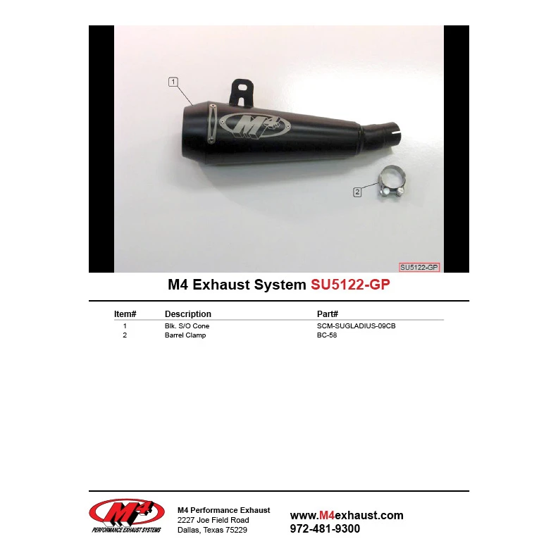 M4 SU5122-GP Slip On Exhaust with Black Muffler is made specifically for Suzuki 650 Gladius/SFV (2009-2016).