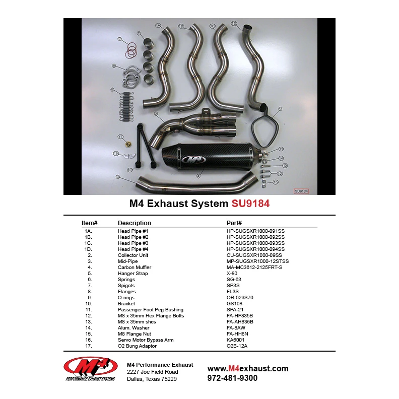 M4 SU9184 Standard Full Exhaust with Stainless Steel Tubing and Carbon MC-36 Angular Muffler is made specifically for Suzuki GSX-R1000 (2012-2016).