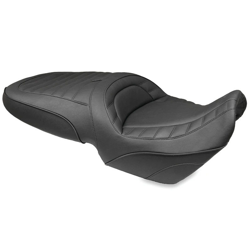 Whether racing up Pike’s Peak or just enjoying a two-up weekend ride on this “modern muscle bike,” Mustang’s touring seat enhances the comfort of the Octane’s classic cruiser riding position. Available with or without a fully adjustable and easily removable driver backrest, the driver sits into a 12.5″ wide seat with deep bucket styling for good lower back support at a similar reach to the controls compared to stock. The passenger seat is a full 10″ wide to offer comfortable 2-up cruising.