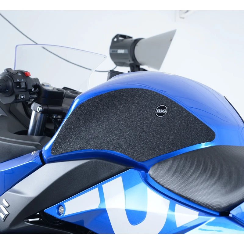 The R&G 2 Piece tank traction grips provide an enhanced connection to the motorcycle with more accurate body position control. Low profile synthetic rubber pads are precision cut for an exact fit that integrates perfectly with the design and shapes of the bodywork. These beneficial grips will keep you planted during hard braking, acceleration and cornering so focus can be placed on the road ahead without having to compensate from sliding on the fuel tank. Reduced pressure on the hands, wrists and arms is achieved as the pads provide proper support of your upper body resulting in added comfort. The most exciting benefit of these grips is that handlebar inputs can be made more precisely so overall handling feels significantly improved. A self-adhesive backing makes installation very simple with no permanent modifications needed. Maximize the smiles per mile of your GSX250 and install a set of tank traction grips from R&G!