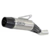The specific link pipe (built in stainless steel AISI 304 with a reduced thickness and proofly cared T.I.G weldings) was studied to guarantee the highest performance and a perfect coupling with the silencer thanks to the usage of a bushing obtained by the full part and CNC worked to guarantee an extreme precision in the montage and a notable aesthetic detail. The silencer is equipped with a fixed attack and the absence of the silencer clamp exalts the refined aesthetic effect. The particular conic structure guarantees a characteristic deep and gloomy sound, which distinguishes all conic silencers.