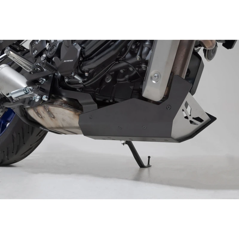 The SW-MOTECH front spoiler, which is tailored to the design of the bike, offers reliable protection against stone chips and unintentional contact with the ground. The powder coating on the surface is extremely durable and permanently protects against corrosion. Extremely sturdy underbody protection can be easily attached to original attachment points using the custom steel attachments provided, all without drilling or welding.