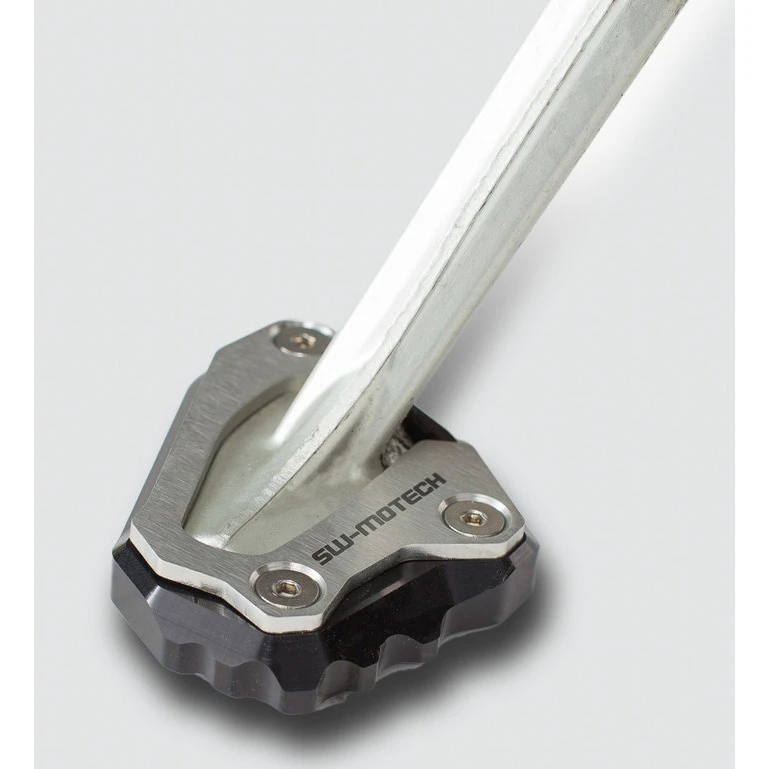 The Sw-Motech Sidestand Foot Enlarger doubles the surface area of your OEM kickstand footprint to prevent sinking into softer terrain or hot asphalt. Lightweight CNC machined aluminum distributes the weight of the motorcycle to offer more support so your R1 is safer to park on varied terrain. The anodized black base features boot gripping ridges to aid in engagement and is secured with a stainless steel retention plate. Don’t let your motorcycle fall over because the hot summer sun made the asphalt soft enough that the kickstand pierced the surface.